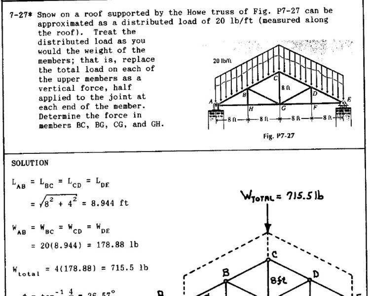 Snow on a roof supported by the Howe truss of the figure can be approximated as a distributed load of 20 lb/ft (measured along the roof). Treat the distributed load as you would the weight of the members; that is, replace the total load on each of the upper members as a vertical force, half applied to the joint at each end of the member. Determine the force in members BC, BG, CG, and GH.