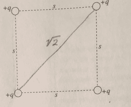 Four identical particles, each having charge q and mass m, are accelerated from rest at the vertices of a square of side L. How fast is each particle moving when their distance from the center of the square doubles?