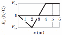 A graph of the x component of the electric field as a function of x in a region of space is shown in the figure [attached] below. The scale of the vertical axis is set by Exs = 47.5 N/C. The y and z components of the electric field are zero in this region. Suppose that the electric potential at the origin is 14 V.
