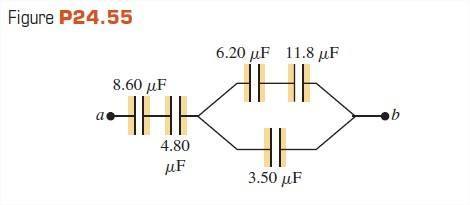 For the capacitor network shown in Fig. P24.55, the potential difference across ab is 12.0V. Find (a) the total energy stored in this network and (b) the energy stored in the 4.80-μF capacitor.