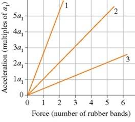 The figure shows an acceleration-versus-force graph, attached, for three objects pulled by rubber bands. The mass of object 2 is 0.300 . What are the masses of objects 1 and 3?
