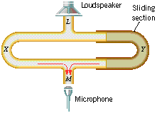The sound produced by a loudspeaker has a frequency of 12,000 Hz and arrives at the microphone via two different paths. The sound travels through the left tube LXM, which has a fixed length. Simultaneously, the sound travels through the right tube LYM, the length of which can be changed by moving the sliding section. At M, the sound waves coming from the two paths interfere. As the length of the path LYM is changed, the sound loudness detected by the microphone changes. When the sliding section is pulled out by 0.020 m, the loudness changes from a maximum to a minimum. Find the speed at which sound travels through the gas in the tube.
