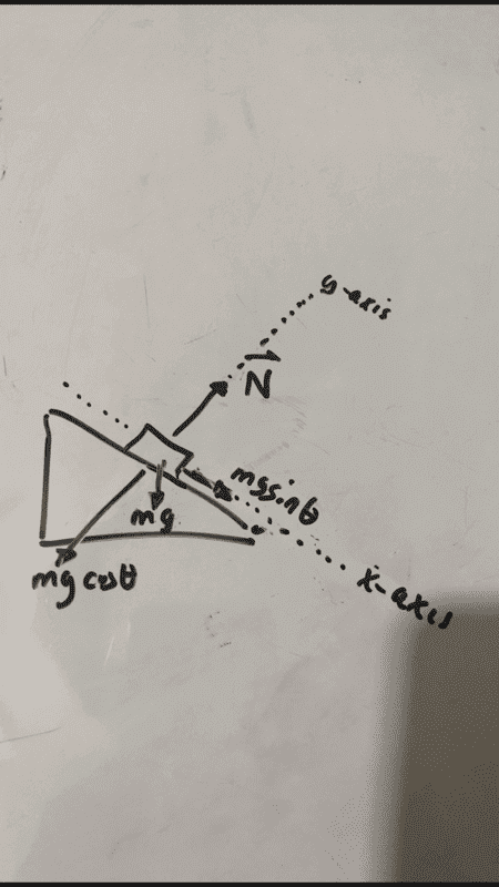 The discussion revolves around calculating the acceleration of a block sliding down a frictionless inclined plane at an angle θ. Participants are examining the forces acting on the block and how to interpret the components of these forces in relation to the axes used in their diagrams.