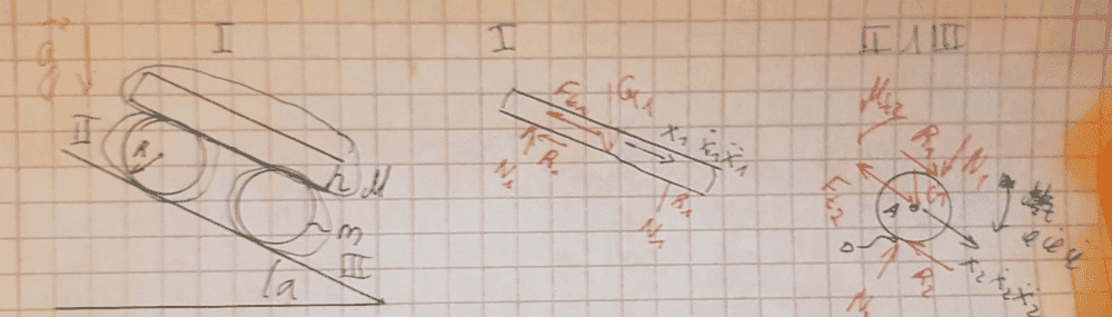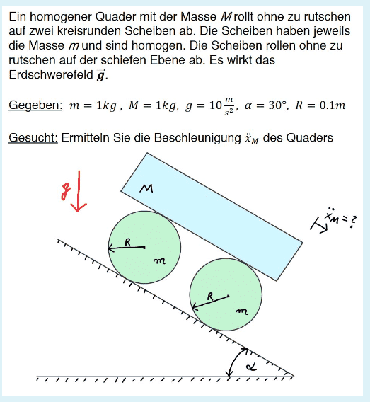 A homogen box with the mass M rolls without sliding on two round wheels. The wheels with mass mass m are also homogen and roll without sliding, on top of the banked Surface. We use Gravitation g.