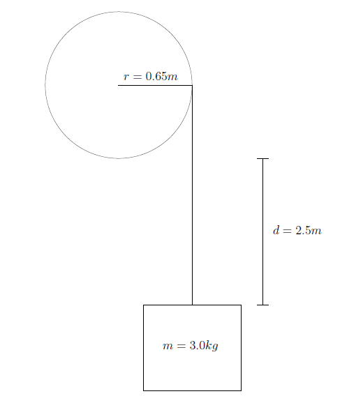 Consider a pulley with a mass-less cord attached to its edge. The rope hangs a distance of d= 2.50 m below the bottom of the pulley. Attached to the end of this cord is a block with mass 3.00 kg. There is also an electric motor attached to the pulley which supplies a torque of 28.7 N * m. The pulley can be considered a disk with a radius of 0.65 m. The mass of the pulley is 1.3 kg.