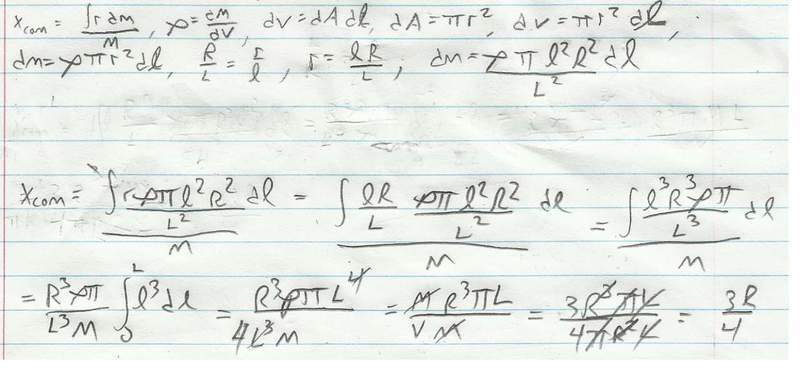 and I am unsure if this is correct or not. The infinitely small sections are circular disks of area pi R^2 were r is the radius of the infinitely small disk and a volume just an infinitely small width dx times the area. therefore the density