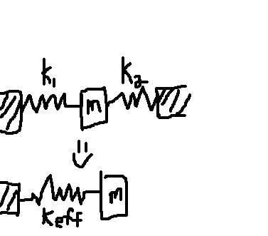 I would like to show theoretically that the first double spring system is equivalent to the second system with only one spring keff. Then I want to derive an expression for keff in terms of k1 and k2.