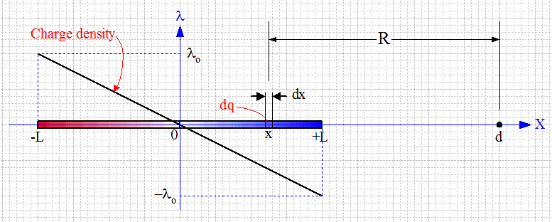 At first I had tried to consider the rod as a dipole, since one end was positive and one was negative, but it seems wrong that way since there is charge throughout and not just at both ends.