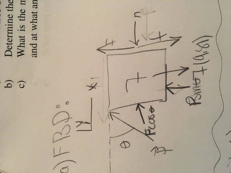 After doing my FBD, I decided that I could do part C to find the minimum force needed, but I just kept the angle at 13°, so I'm not sure I did that correctly, either.