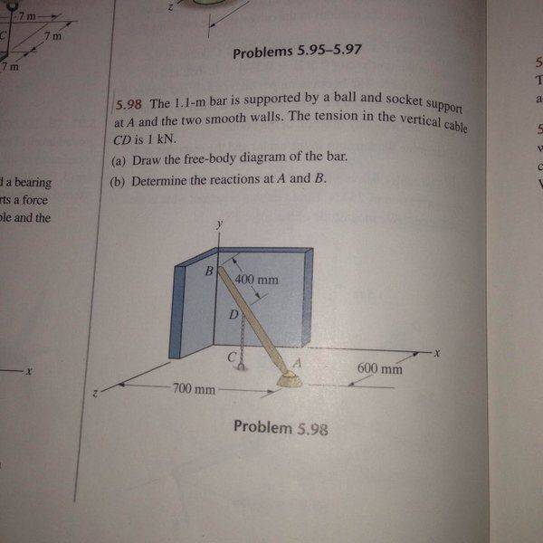 The 1.1m bar is supported by a ball and socket support at A and 2 smooth walls. The tension in the vertical cable CD is 1kN.
