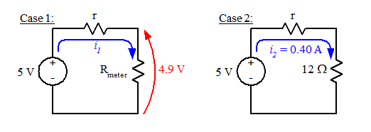 Then we have 4.9 = 5 - I r → I = 0.2 A and the resistance is R = V / I = 4.9 / 0.2 = 24.5 Ω.