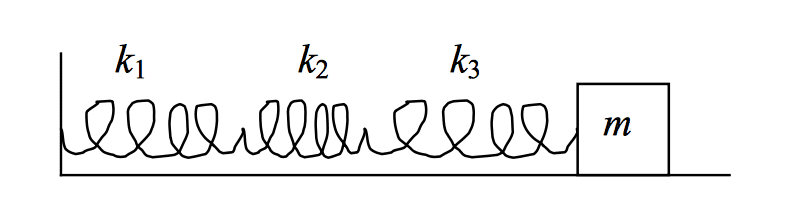 A 3.0kg mass is connected to a system of three springs, k1 = 100N/m, k2 = 80N/m, and k3 = 150N/m, as shown below.