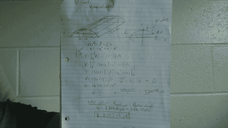 Determine the number of cubic yards of crushed rock necessary to make a roadbed with the cross-section shown below, if the road is to be 1/4 mile − long. Assume that the crown of the pavement is an arc of a parabola, with its vertex at the top center. Be careful with units.