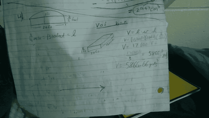 First i found the volume of the lower part of the road bed and converted inches to feet. V= l*w*h =(1320ft)(20ft)(2/3ft) = 17600 ft^3 . 17600ft/3 = 5866.667 yds^3.