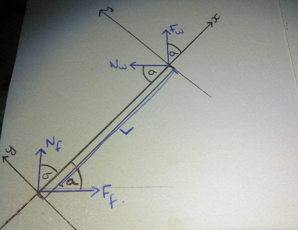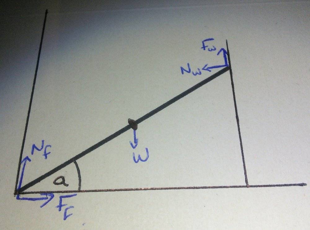 - A ladder of length 'L' is leant against a wall, making an angle of 'a' with the horizontal. There are five forces acting on it (normal from floor, friction from floor, weight in centre of ladder, normal off wall and friction on wall), and the coefficient of static friction is 0.6 at both points.