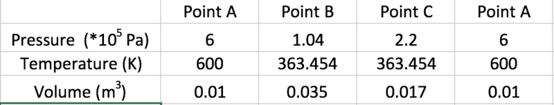 - Participants discuss calculating work by determining pressure or volume at various stages of the thermodynamic cycle. There are attempts to use inverse proportions and equations relating pressure and volume, with some questioning the validity of their approaches.
