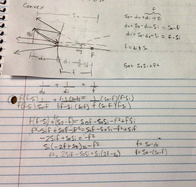 Derive the mirror equation for a convex mirror (Si*So=f^2). Do not use a Ray heading toward the center of curvature point (C).