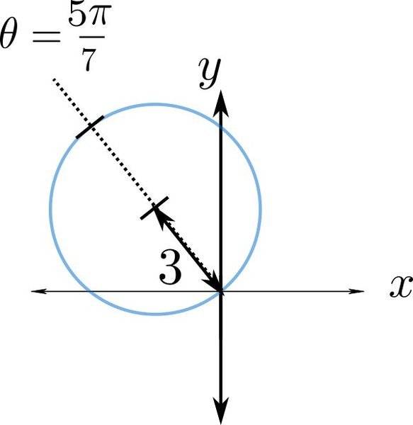 Consider the line whose shortest distance to the origin is 5 and that is perpendicular to the ray ##\theta= \frac {5*\pi}{7}## for r>0