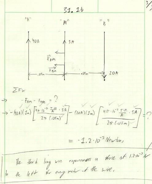 Two long fixed parallel wires, A and B, are 10 cm apart in air and carry 40 A and 20 A, respectively, in opposite directions. Determine the resultant field (a) on a line midway between the wires and parallel to them and (b) on a line 8.0 cm from wire A and 18 cm from wire B. (c) What is the force per meter on a third long wire, midway between A and B and in their plane, when it carries a current of 5.0 A in the same direction as the current in A?
