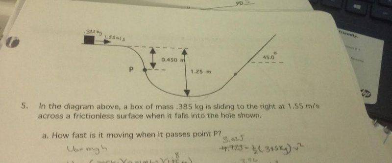 In the diagram above, a box of mass .385 kg is sliding at the right at 1.55 m/s across a frictionless surface when it falls into the hole shown.