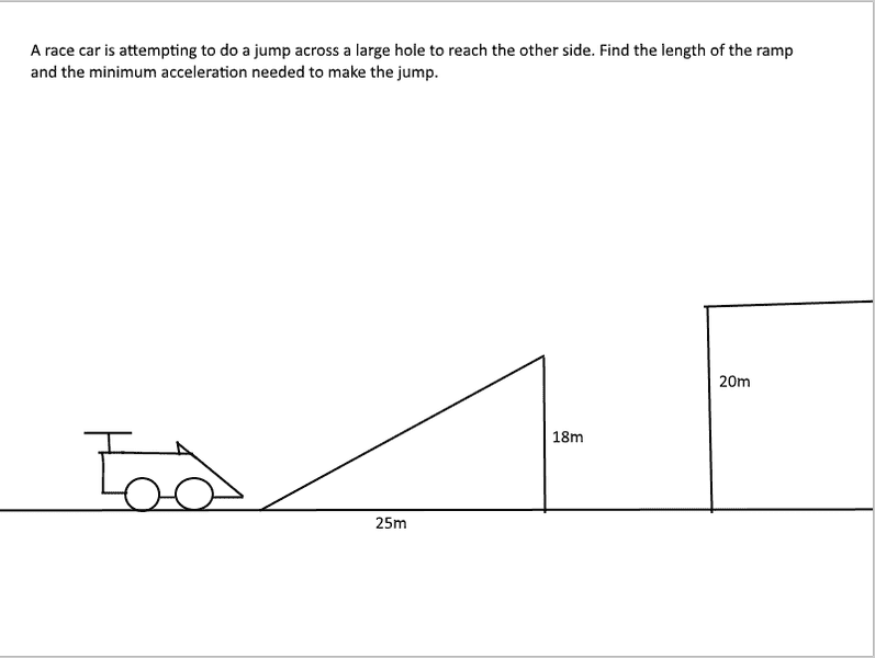 The discussion revolves around determining the acceleration required for a vehicle to successfully clear a jump from a ramp. The problem involves concepts from kinematics, specifically related to projectile motion and the relationship between velocity, distance, and acceleration.