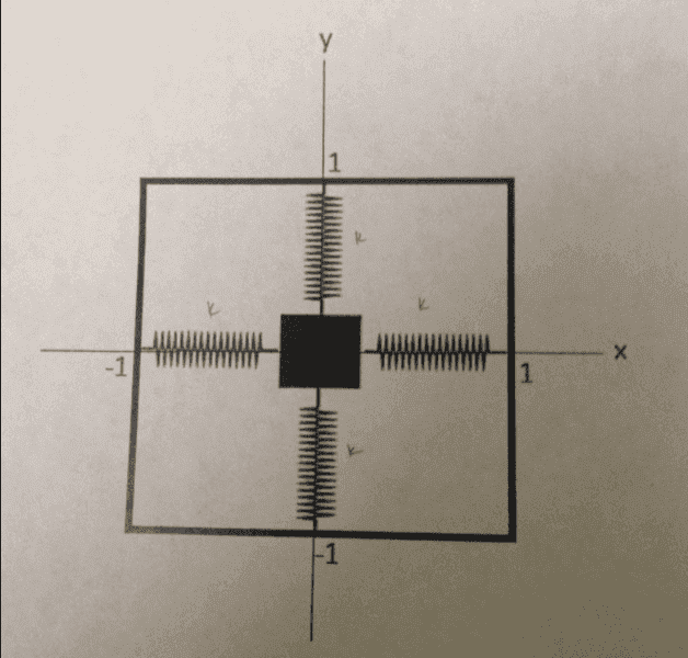 A block is attached to the sides of a square box by 4 springs. The box is placed horizontally on a frictionless surface (ignore gravity). The mass of the block is ##m##, the natural length of each spring is ##l##, and the strength of each spring is ##k##. Place the block at ##(0,0)##. Let ## x(t), y(t)## the position of the block in time. Find the equations of motion of the block. (Use vectors to break each force up into its vertical and horizontal components)