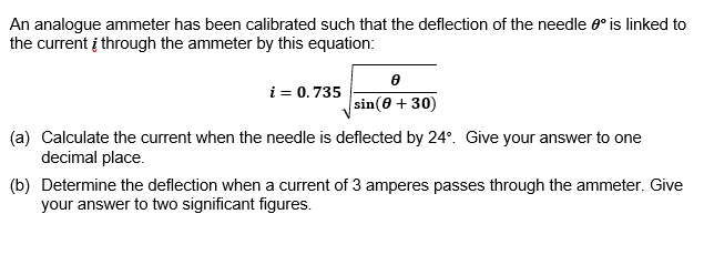 The discussion revolves around solving an equation used to calibrate an ammeter, specifically focusing on the variable theta and its representation in the equation. Participants are trying to understand how to graphically represent the relationship between current and theta.