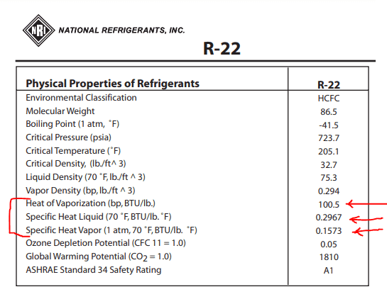 Looking at that superheat table's enthalpy in column H, the BTU change from 235-ish to 90 °F is around 143 - 117, just 26 BTU per pound of Freon for the 135 degree cooldown..
