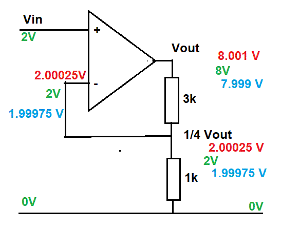 In blue I show the output drifting a little below 4x the input. Following the blue numbers, 1/4 of the output gets back to the inverting input. Now the + input is higher than the - input, so the output will go up, back towards 8V