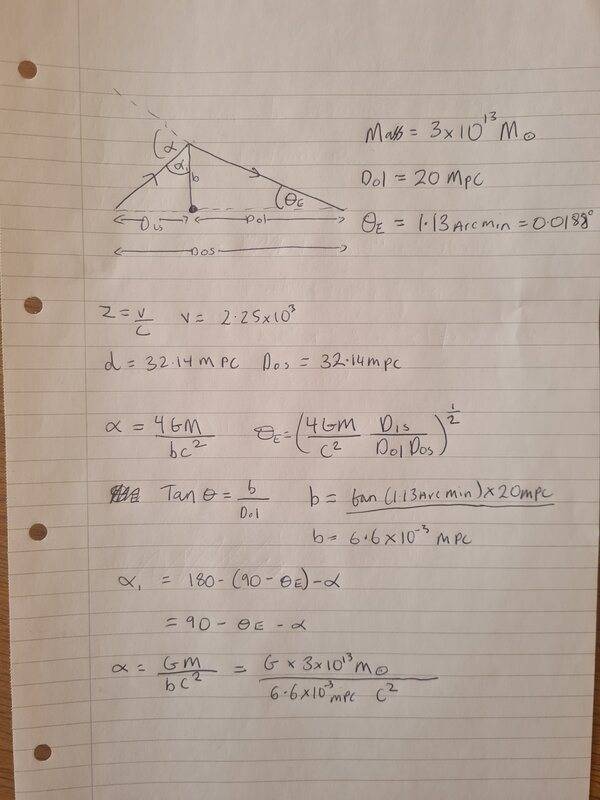 I have attempted to link the equations, but I don't really understand how the data given fits. Does the angular radius get plugged in as the deflection angle?