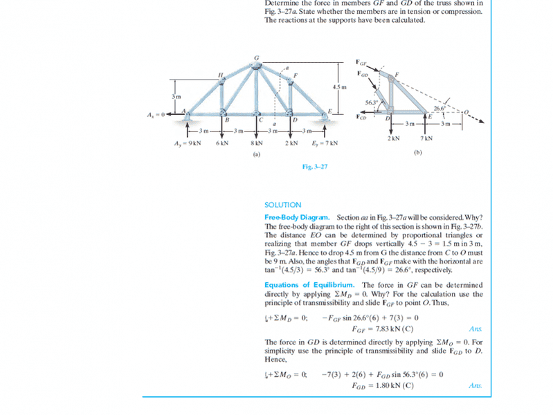 The discussion revolves around the calculation of moments in truss analysis, specifically how the force component FGF sin26.6 generates a moment about point D. Participants explore the implications of selecting different points of application for the force components in their calculations.
