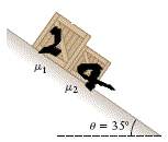 Figure shows two blocks in contact sliding down an inclined surface of inclination 30.The friction coeffecient between the block of mass 2kg and the incline is μ=0.20 and that between block of mass 4kg and the incline is μ=0.30.Find the acceleration of 4 kg block (g=10m/s2) (Angle of the incline is 30) (Coeffecient of friction as per the question,not by the diagram)