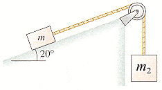 The figure below shows a block of mass m resting on a 20° slope. The block has coefficients of friction µs = 0.74 and µk = 0.52 with the surface. It is connected via a massless string over a massless, frictionless pulley to a hanging block of mass 2.0 kg.