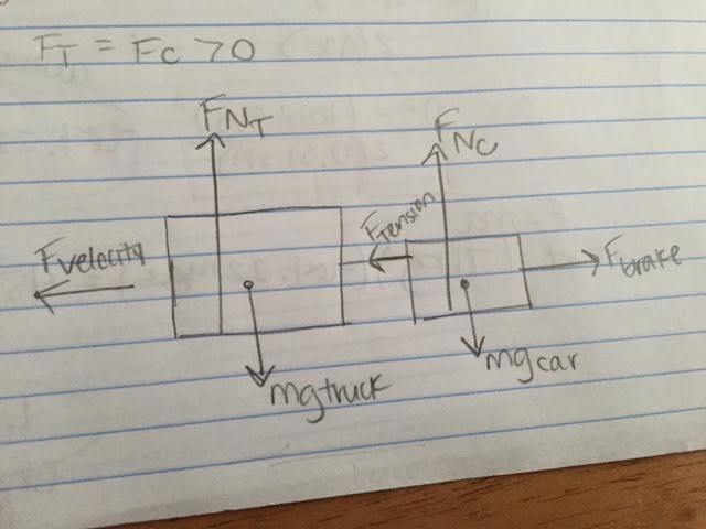 I know that the answer to all of the scenarios are FT = FC > 0 (the key for this past homework problem is available to me), but I trying to explain the concept to myself. The 3rd one is the hardest one for me. I suppose since the mass of the car and truck are not changing, that the truck must be moving at a faster speed to compensate for the emergency brake? Am I thinking about this correctly?
