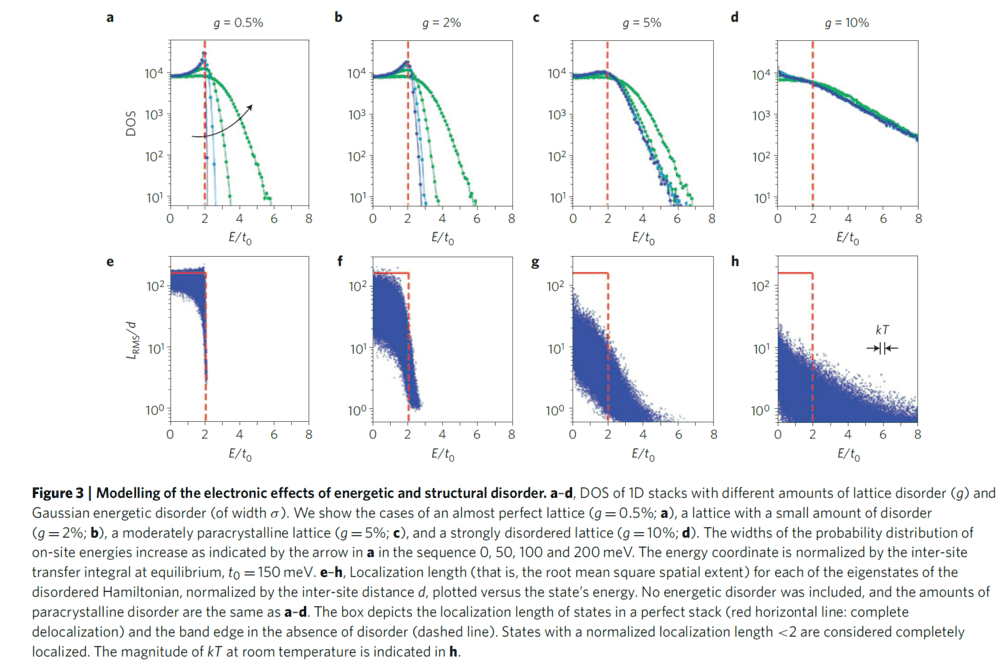 "In the case of negligible paracrystallinity, the density of states (DOS) of the 1D pi-stack depends on the amount of on-site disorder generating a Gaussian tail of states extending into the bandgap (Fig. 3a). Typical pi-stacks of conjugated polymers exhibit moderate amounts of paracrystalline disorder (g >5%; see below). Under these conditions, the DOS of the aggregate is hardly affected by on-site disorder and is determined by the amount of paracrystallinity (Fig. 3c,d). The spatial extent of the calculated wavefunctions for the disordered stack (Fig. 3e-h) shows that disorder-induced states that lie deeper into the DOS tail are increasingly localized. Even states within the originally `delocalized band' become more localized with increasing paracrystallinity. In the limit of large positional disorder (g ~10%), the distinction between band and tail disappears: a single broad distribution of localized states with a monotonically decreasing DOS extends into the bandgap, reproducing well-known results of electronic structure theory of amorphous materials34,35. In the intermediate paracrystallinity regime (g ~3-7%) we observe a coexistence of localized and delocalized states, indicating that in paracrystalline aggregates charge is transported by a mechanism where mobile charge is temporarily trapped in localized states, akin to multiple trapping and release."