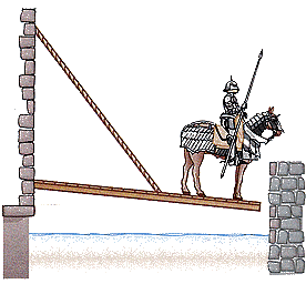 Sir Lost-a-Lot dons his armor and sets out from the castle on his trusty steed in his quest to improve communication between damsels and dragons. Unfortunately his squire lowered the draw bridge too far and finally stopped it 20.0° below the horizontal. Lost-a-Lot and his horse stop when their combined center of mass is 1.00 m from the end of the bridge. The uniform bridge is 10.00 m long and has a mass of 1800 kg. The lift cable is attached to the bridge 5.00 m from the hinge at the castle end, and to a point on the castle wall 12.0 m above the bridge. Lost-a-Lot's mass combined with his armor and steed is 950 kg.