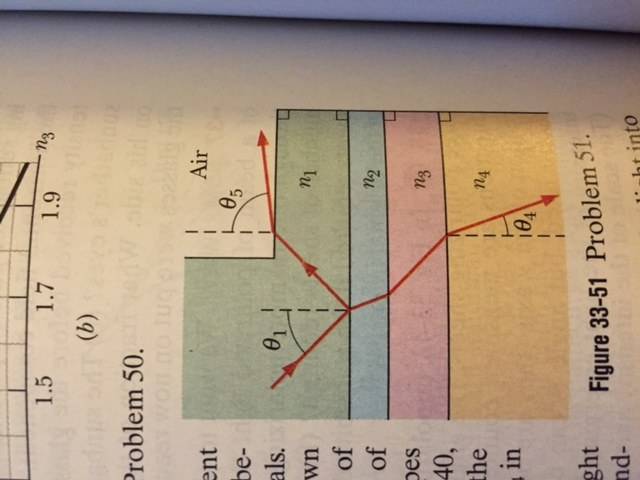 In the attached figure, light is incident at angle $${\theta}_{1} = 40.1^{\circ}$$ on a boundary between two transparent materials. Some of the light travels down through the next three layers of transparent materials, while some of it reflects upward and then escapes into the air. If $${n}_{1} = 1.30$$, $${n}_{2} = 1.40$$, $${n}_{3} = 1.32$$, and $${n}_{4} = 1.45$$, what is the value of (a) $${\theta}_{5}$$ in the air and (b) $${\theta}_{4}$$ in the bottom material?