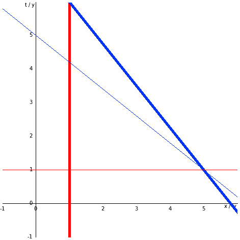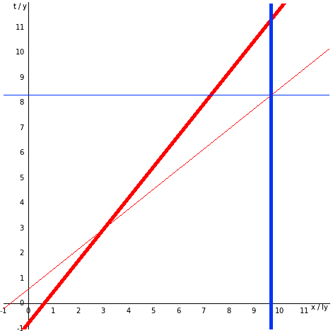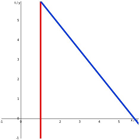 If you haven't come across spacetime diagrams before, they are "maps" of spacetime, with time (as defined in this frame) drawn up the page and space (again, as defined in this frame) across it. Tom, therefore, appears as a vertical line (red on the diagram) because he doesn't change his position in this frame. Mary is a slanted line (blue on the diagram) because she is moving. Notice that Tom has been placed at 1ly, and Mary reaches 4ly from him at t=1. Let's add a line showing Tom's idea of "all of space at the moment that Mary is 4ly away from him":