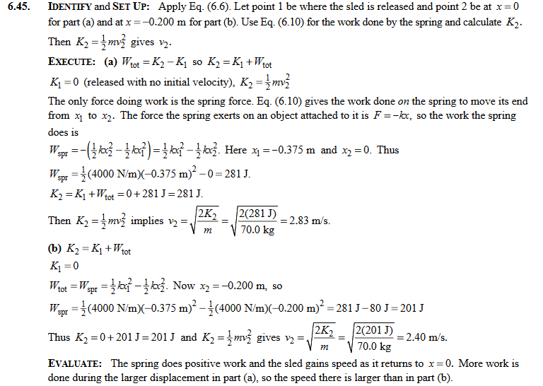 At a waterpark, sleds with riders are sent along a slippery, horizontal surface by the release of a large compressed spring. The spring, with force constant k = 40.0 N/cm and negligible mass, rests on the frictionless horizontal surface. One end is in contact with a stationary wall. A sled and rider with total mass 70.0 kg are pushed against the other end, compressing the spring 0.375 m. The sled is then released with zero initial velocity. What is the sled's speed when the spring (a) returns to its uncompressed length and (b) is still compressed 0.200 m?