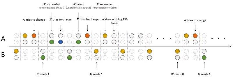 Now suppose that the scientists combine the following: B' would only measure the Green/Yellow properties at a regular known interval. If A' wants to send the code "1", they should measure Blue/Red, then Green/Yellow, then Blue/Red, then Green/Yellow... until the Green/Yellow property changes randomly. If A' wants to send the code "0", they just don't do anything until B' measures the same Green/Yellow property a lot of times (say... 256), concluding that it's bad luck that A' couldn't change the property so many times (there is an image to help with visualization)
