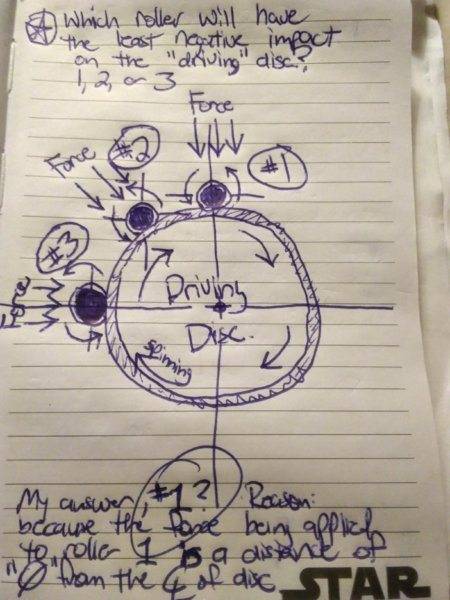 1m diameter solid disc spinning at 10 rpms with a subsequent .5m diameter solid disc being driven by the 1m sokid disc.