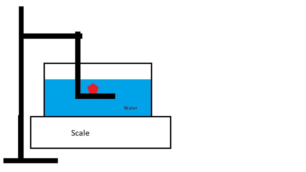 On a scale, we place a jar filled with water. We place in the water a platform which is attached to a construction which is resting on the table next to the scale. Then we zero the scale.