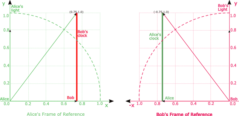 - Relative to clock A, the light has traveled the extra distance 0.6 light seconds along the x-axis to point (0.6,0.8) and 0.75 light seconds with clock B (in clock A's frame) by the time it has reached the mirror.