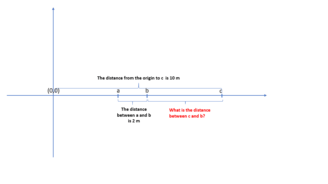The distance between the final destination (10,0) and the point (b,0) is calculated as 10 - b. The person walked a total distance of 10 meters from the starting point (0,0) to the final destination (10,0). Prior to reaching the final destination, the individual stopped between two points, (a,0) and (b,0), with a distance of 2 meters separating them. This discussion clarifies the relationship between these points and the final destination.