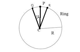 - Let there be a ring of mass m and radius r. Let 3 masses be attached to the ring and named as O,P and Q. Mass of O and Q is 2m and mass of p is M. The angle between 2 masses is 15 degrees as shown in the figure.
