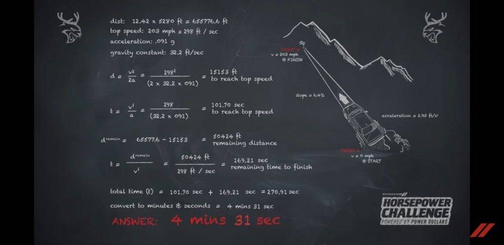 The discussion revolves around determining the time it would take for a car to ascend a straightened mountain road, originally characterized by a slope of 6.4%. The car starts from rest and has a top speed of 203 mph, with an average acceleration of 2.93 ft/s². The original course length is noted to be 12.42 miles with numerous turns, raising questions about how this distance changes when considering a straight ascent.