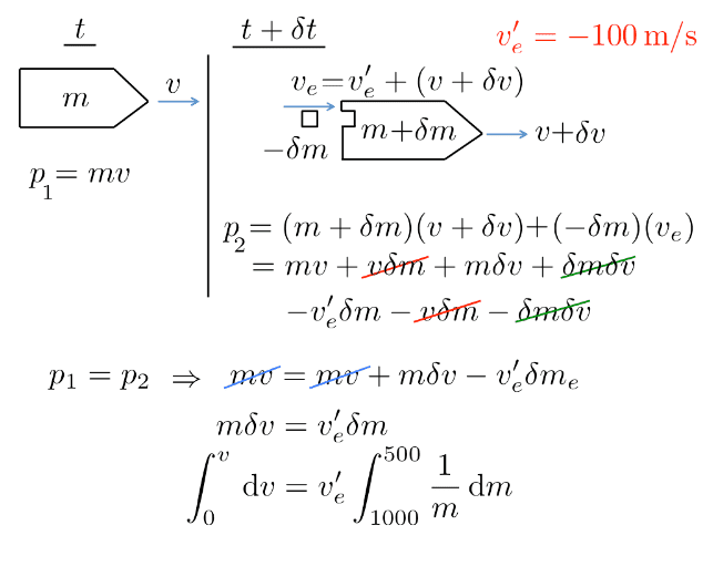 The solution of this problem shows a mass being added up into the rocket and the mass being ejected. Then later on, the solution takes the mass at end m+dm and applies integral. How come be a such a large change modeled by dm or dv, i.e a small change? Also, how is the mass being added upto the rocket? Please answer these two questions descriptively. The picture is attached below