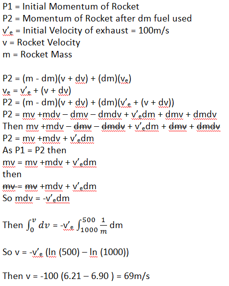 A rocket starts from rest in deep space. The rocket structure and systems weigh a total of 500kg and it has 500kg of fuel initially. When the engines are fired, fuel is ejected from the end of the rocket at a speed of 100m/s relative to the rocket.