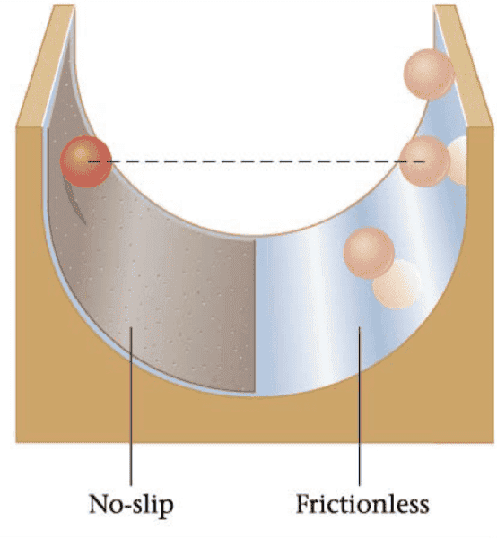 A solid ball with radius of 9.7 cm is released from the height of hs=88.1 cm on a non-slip surface. After reaching its lowest point the ball begins to rise again, on a frictionless surface. How high does the ball rise on that side? Express your answer in cm.
