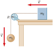 However, why do we pick the same velocities for the objects? (aren't they accelerating, and thus having different velocities?). As well, why do we choose the radius of the pulley for mass 1 and mass 2 to be that way? (isn't angular momentum calculated for objects in linear motion as the distance from the origin, which in this case is the axle of the pulley?).